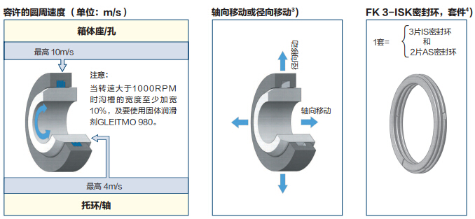 用于滾動(dòng)及滑動(dòng)軸承的油脂密封,如果抹上油脂,它能防止灰塵的侵入及環(huán)境濕度的影響。組合套件“FK 3-ISK”(增加溝槽底部的密封)由于迷宮的回路增加其密封效果也增加了。